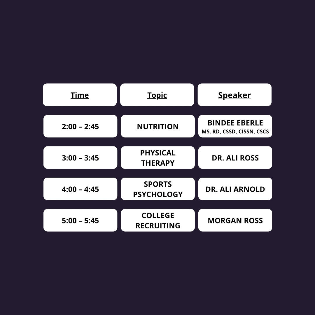 A one-day event for parents & athletes to learn from the best in nutrition, sports psychology, physical therapy, and college recruiting.